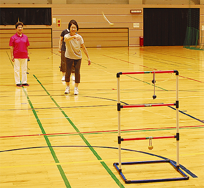 愛川町の第1号公園体育館で9月14日、愛川町レクリエーションスクールが行われ、町民約10人がニュースポーツの「ラダーゲッター」を体験した。