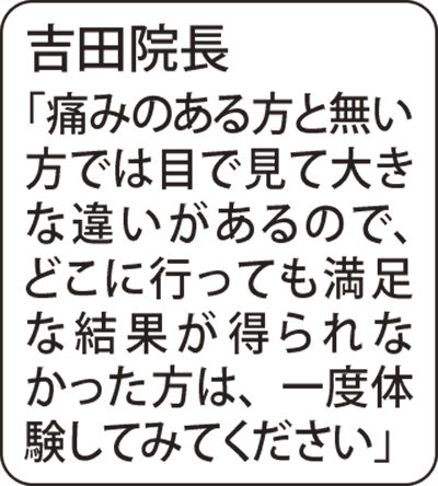 吉田院長は「特に腰痛関係には絶対の自信を持っています」と話す。その証拠に「お帰りの際に腰椎に痛みが残っていたら料金は頂きません」とキッパリ。
