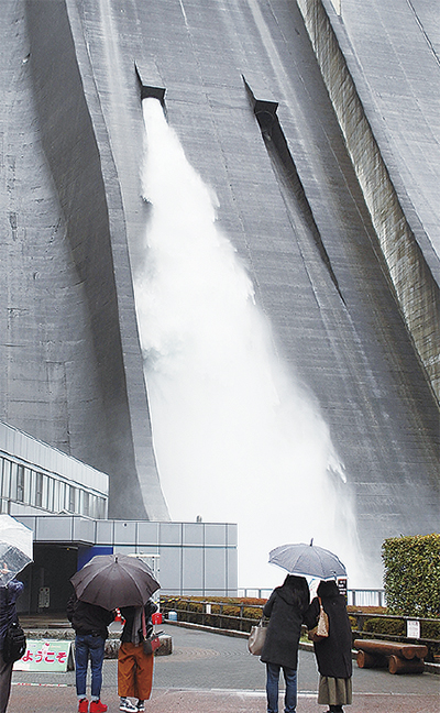 同ダムでは完成後初となる油圧ユニットの更新が行われ、新たな設備の機能確認として行われた。通常の観光放流では2つの洪水吐から合計で毎秒30tの水が流れるが、今回の点検では一つの洪水吐から最大毎秒100tを放流。観光放流とは桁違いの放水に、大きな水しぶきが舞った。