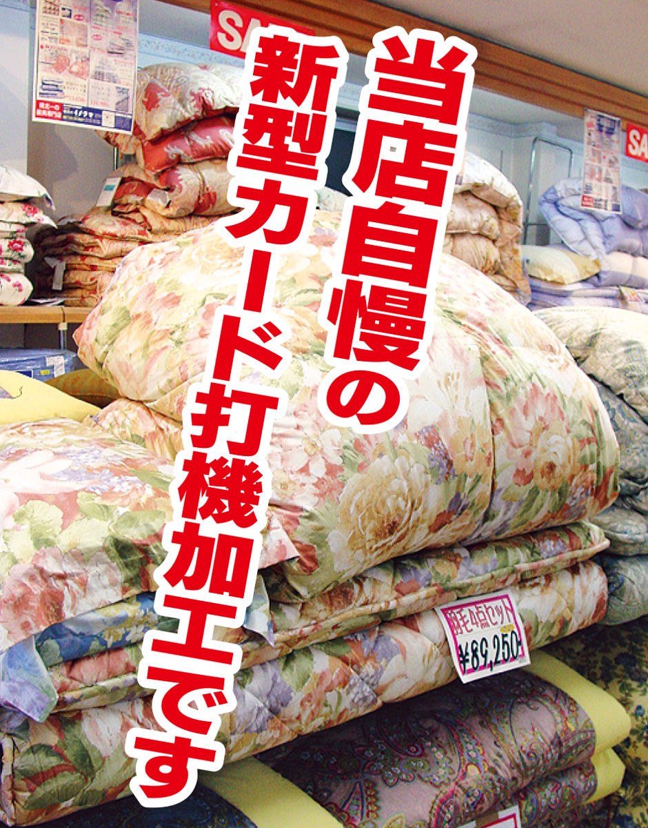 あなたはもう、ふとんが生まれ変わると好評の「ふっくら若返り加工」をお試しだろうか。同店では、掛・敷ともにシングル各8900円より承り中。