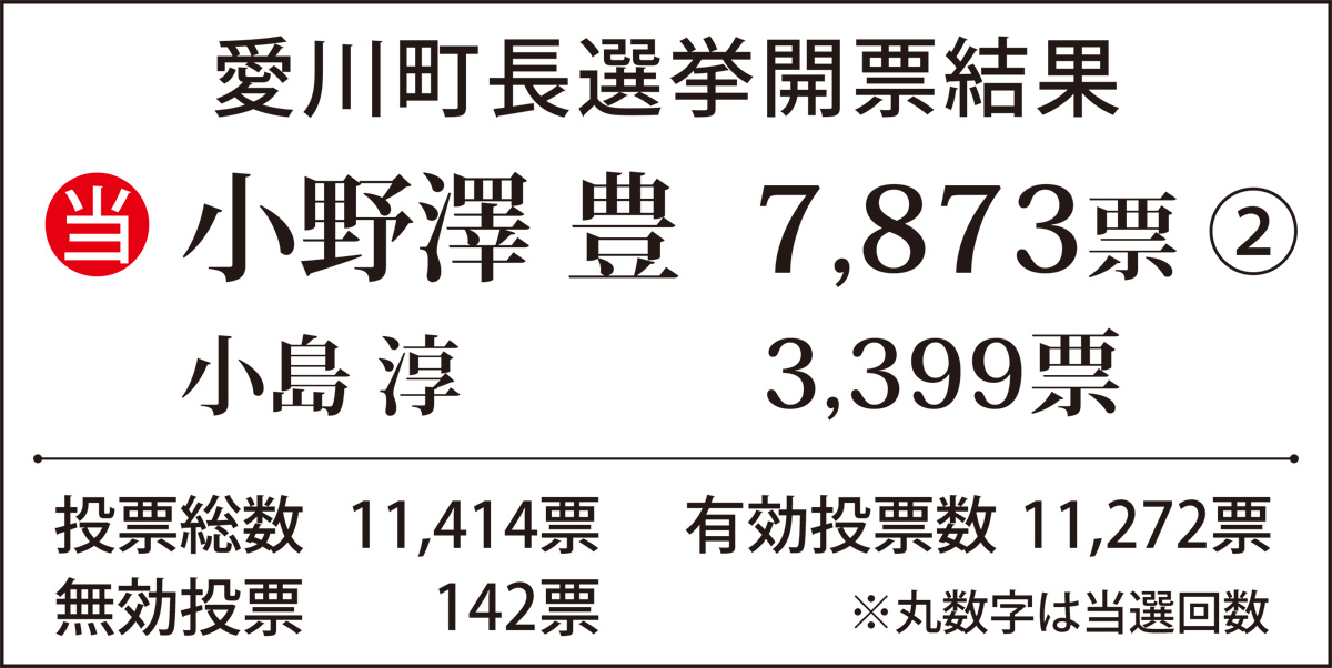 任期満了に伴う愛川町長選挙は6月17日に投開票が行われ、現職の小野澤豊氏(65歳)が新人の小島淳氏(37歳)を破り、再選を決めた。投票率は前回を12・16ポイント下回り35・23%だった。