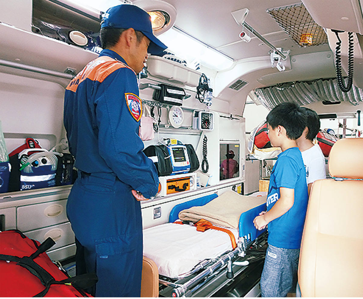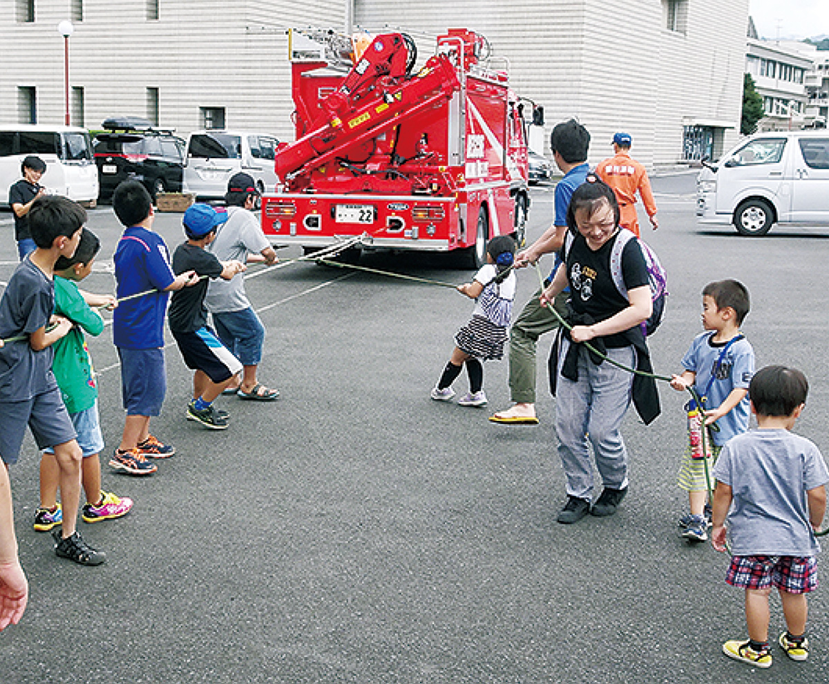 この日は、非常時に役立つ炊き出し袋での炊飯を行った後、胸骨圧迫やAEDを使った心肺蘇生法を学んだ。救急車などの資機材についても見学し、消防職員が解説を行った。また、救助工作車との綱引きでは、親子で元気にロープを引いた。