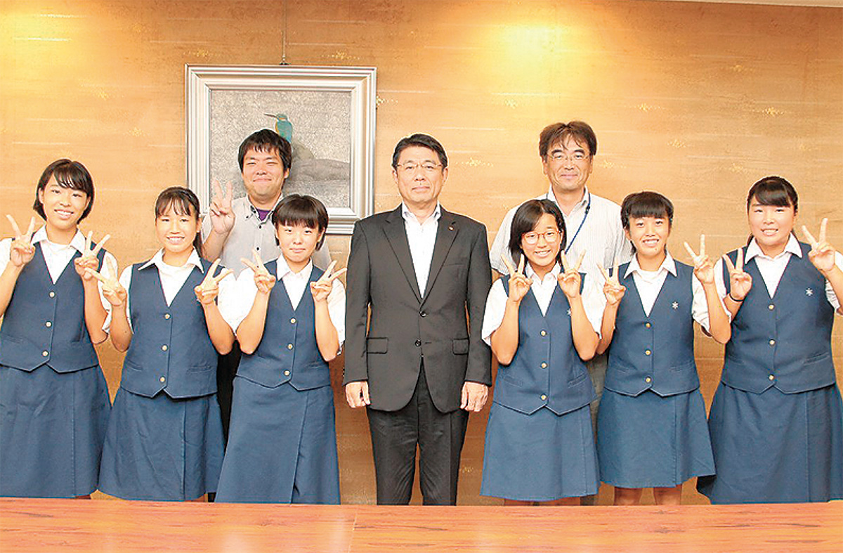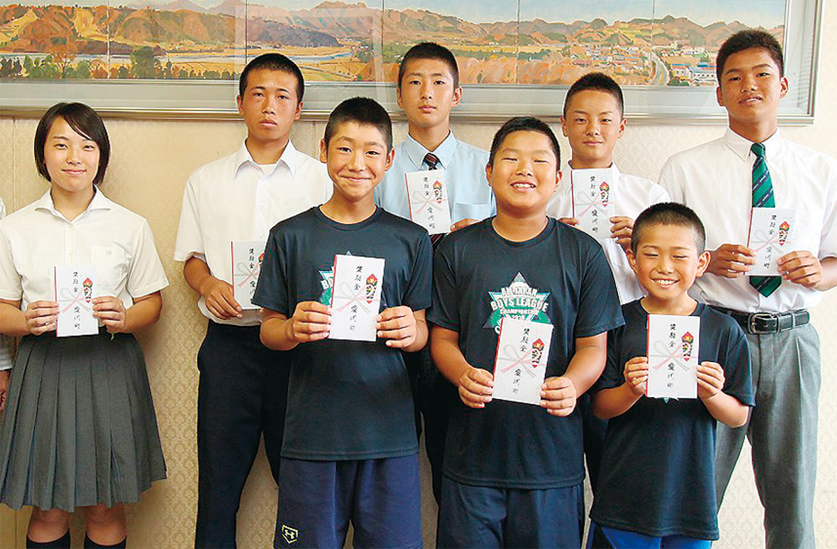 8月13日には、硬式野球で全国大会に出場した相模ボーイズの選手と、剣道で全国大会に出場した桐蔭学園高等学校3年の渡部日向子さん(春日台)が町役場を訪問した。