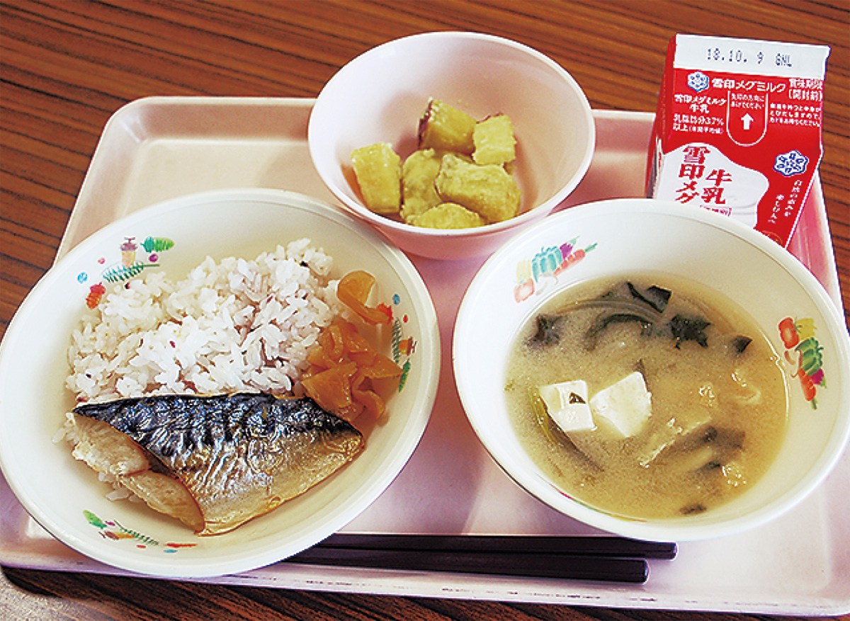 この日の献立は十穀米ごはん、牛乳、サバの塩焼き、みそ汁、ふかし芋、つぼ漬け。菅原小学校でも全学年の児童が普段とひと味違う給食を体験。1年生も「サバが美味しい」と、笑顔を見せた。