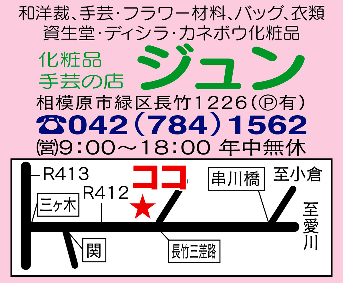今年も嬉しい大サービス。可愛らしい吊るし雛と温かい手作り品が人気の『化粧品と手芸の店ジュン』は、新春感謝セールとして、2月11日(祝)まで「手芸用品全品、衣類、バッグなど20%引き」でご奉仕してくれる。