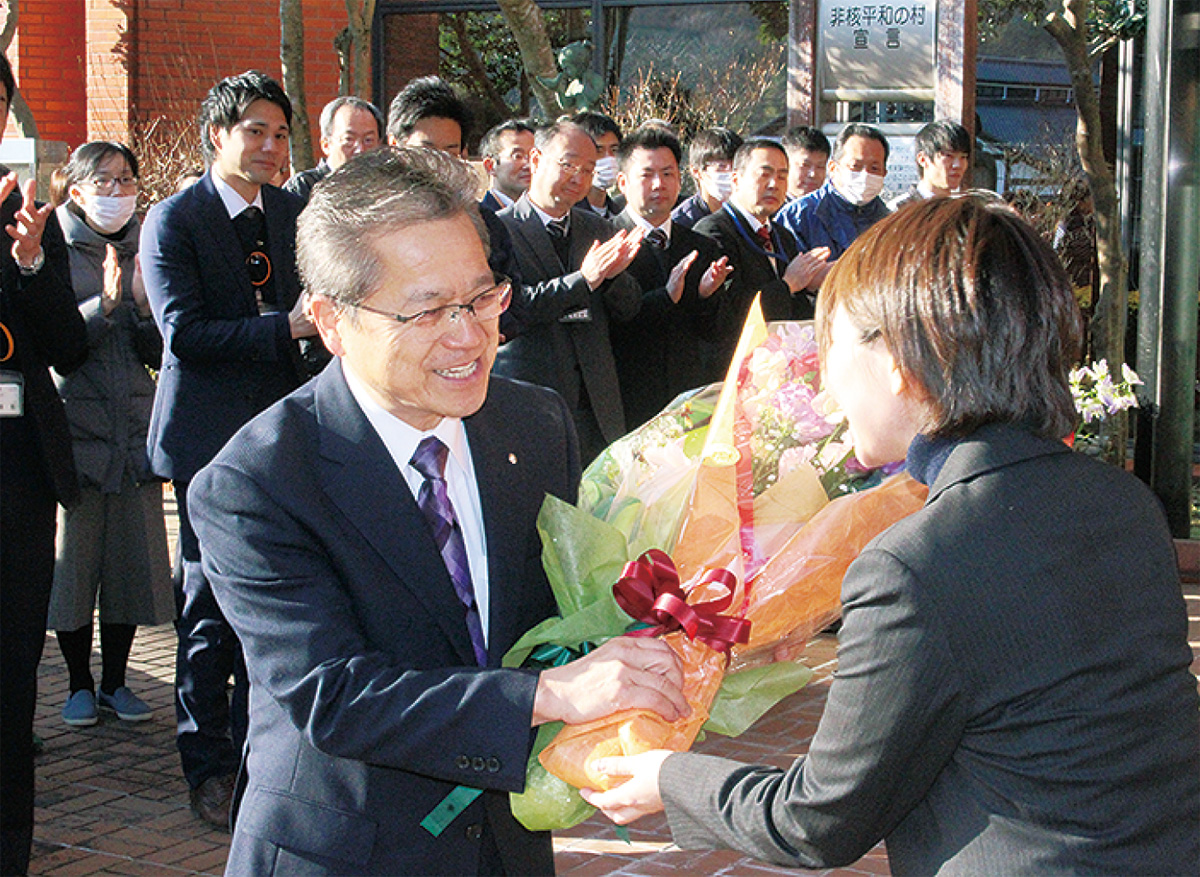 初登庁の朝は、村役場本庁舎の正面入り口に並んだ職員らが拍手とともに岩澤村長を迎えた。歓迎の花束を受け取った岩澤村長は、村長として初めて庁舎に入り、就任式に臨んだ。