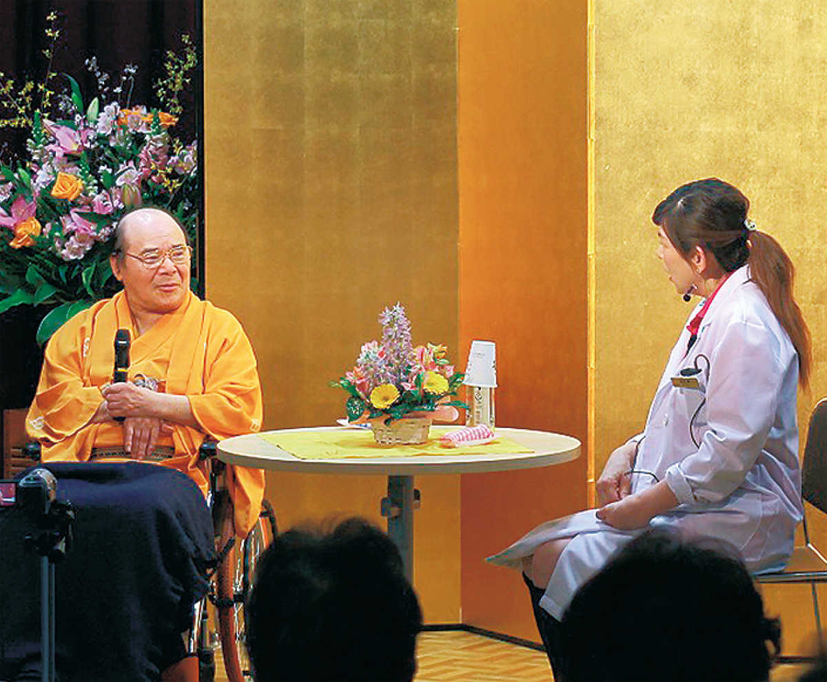 講演では、咲さんが母親の介護やこん平師匠のマネージメント業務の様子、2005年にこん平師匠が多発性硬化症と診断された時のエピソードなどを語り、忙しい生活を知恵と行動力で乗り越えた経験などを話した。また、こん平師匠ゆずりの快活なトークで落語絵本読み聴かせを行った。