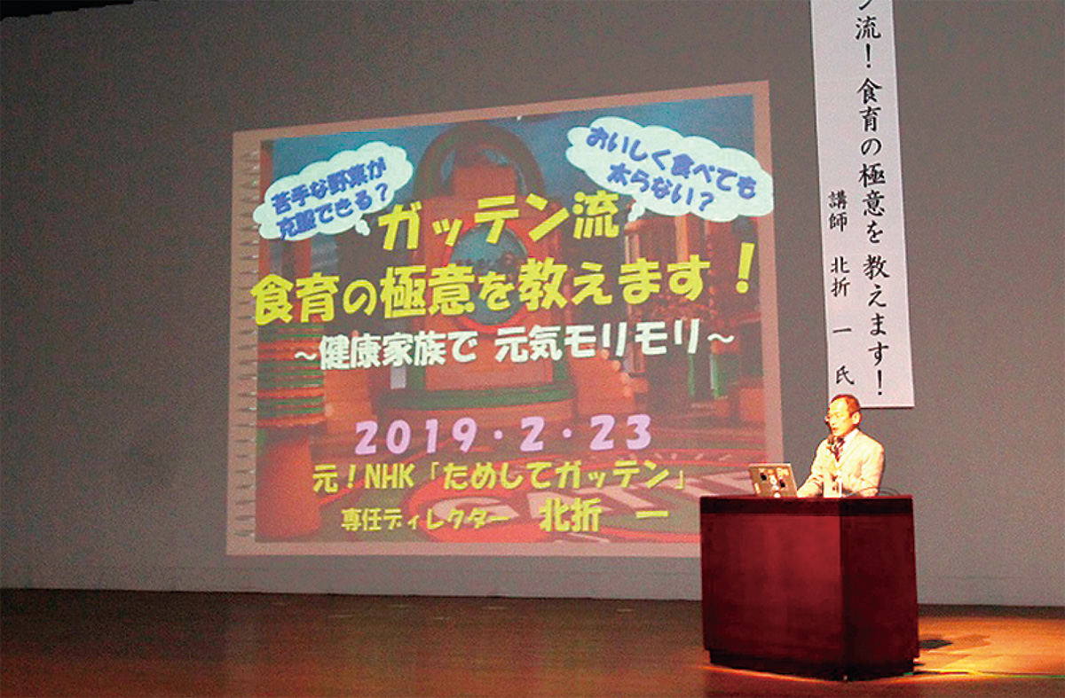 また、第2部の教育講演会では、NHK「ためしてガッテン」元演出担当デスクの北折一氏を講師に迎え、「ガッテン流!食育の極意教えます〜健康家族で元気もりもり」をテーマに講演した。