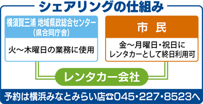 昨年12月に一般発売され、神奈川県庁に納入された「日産リーフ」。EV(電気自動車)の普及に力を入れる県では、気軽にEVを体験できる機会を提供するため「EVシェアリング事業」を実施している。横須賀市内では今月から、県合同庁舎で導入された日産リーフを、業務に使用していない金〜月と祝日にレンタカーとして貸出を始めた。これに関連し、市内のインフラ整備も進んでいる。