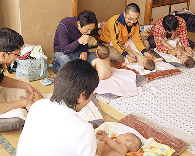 講座終了後の感想は、「子どもの笑顔に癒された」「家でも、時間があるときはやってみたい」「子どもとこういう体験ができて嬉しい」など、赤ちゃんの扱いに苦戦しながらも楽しんでいた。また、同月齢の子どもと接する機会が少ない父親たちにとって、貴重な出会いにもなったようだ。