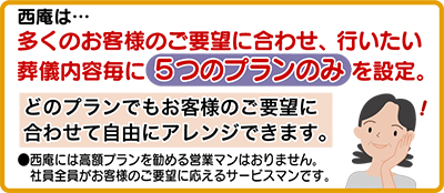 西庵グループが第一に掲げるのは「料金体系に不明瞭な価格設定が無い」ということ。葬儀内容ごとに5つのプランのみを設定。