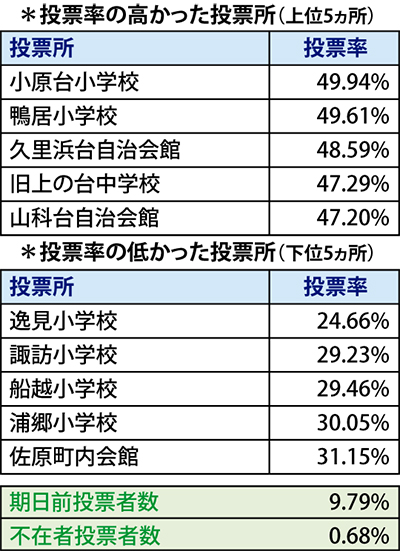 これを顕著に表していたのが投票率。過去16回の市議会議員選挙(補選を除く)で過去最低の47・98%。投票所別でみると、小原台小学校の49・94%が全地域で最も高い投票率だった一方、最も投票率が低かったのは逸見小学校の24・66%。期日前投票は順調に伸ばしていたが、投票日前日の悪天候もあり足踏み。投票率の底上げまでは至らなかった。