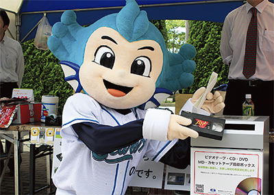 試合会場の横須賀スタジアムで、不要なCD・MD・DVDなどの記録メディアを回収。集めたものは障がい者などが働く市内の作業所で素材(プラスチックや金属)ごとに分別し、再生樹脂としてリサイクルする。昨年はビデオテープ800本、DVDとCDが計500枚集まったという。
