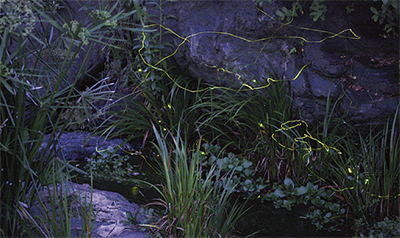 園内のビオトープに生息する無数のホタルは、ホタル研究の第一人者として知られる大場信義さん(馬堀海岸在住)が管理している。