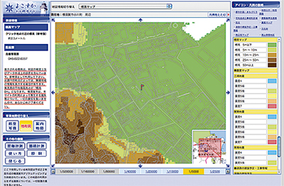 横須賀市では平成14年から「よこすかわが街ガイド」の運用を開始。これはGIS(地理情報システム)を用いて、地図データと様々な統計データを統合的に表示するもの。公共施設や医療施設の検索をはじめ、都市計画や地価なども地図上で確認することができる。また、防災に関するカテゴリーでは、土砂災害警戒区域や急傾斜地保全区域・地すべり防止区域や避難場所、さらに震度マップ(三浦・関東・東海)などを色分けで表示。この項目に追加されたのが「標高マップ」だ。GISを活用する自治体は増えているが、標高に限定した検索システムは珍しいという。