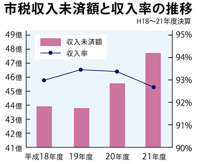 市税等の滞納額は年々増加を辿る。市民税に関していうと平成21年度の収入未済額は約22億7268万円(滞繰分含む)、収入率91・64%。平成19年度の税源移譲で所得税が減り、市民税の割合が増加したことも滞納額増加の原因と言われる。