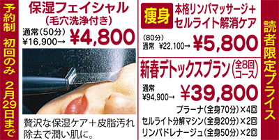 一度の体験でウエスト5センチ減も多数なのが、インド痩身サロン「プレステージ」の本格リンパマッサージ「プラーナ」。同店人気No.1のプラーナにセルライト解消&引締めに効果的な「セルマシーン」ケアがついた80分スペシャル痩身コースが5800円(体験価格・初回のみ)。「流す・揉み込む・押し流す」の手技が絶妙なオールハンドケアだから、脂肪撃退、毒素排出に最適。1月はこみ合うので早めに予約を。