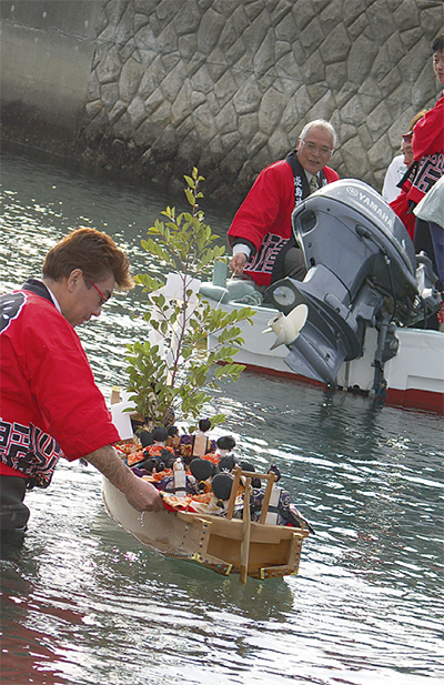 これは、横須賀風物百選にも選ばれているもので、祭礼では「あわせてください淡島様よ、お札参りは二人づれ」と、安産などを願い、底の抜けた柄杓の柄(え)に麻を結んで奉納。続いて、神社下の芦名海岸で小船に乗せたひな人形約30体を前に祝詞を挙げて神事が行われ、神主・巫女らが乗ったボートで小船を引き、湾内を回った。