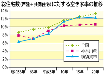全国の住宅・土地統計調査に基づく空き家率の推移を見ると、横須賀市はこの20年余りで高い増加率を示している(左表参照)。「空き家」というと、郊外のイメージが強いが、市の調査では、横須賀は土地形状の特徴から比較的市街地に近い谷戸で空き家が増加。その状態についても、修繕や建替を要するものが7割を占め、空き家になってから長期間放置されている傾向があった。