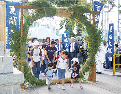 夏越の大祓は、日頃無意識のうちに身につけた災厄を祓い清める神事。直径2メートル大の茅の輪を8の字を描くようにくぐり、無病息災を願う。震災復興の祈りとともに、大津地区の安寧も祈願される。