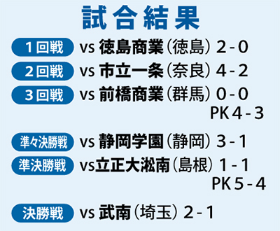 大会前にチームが掲げた目標は「8強入り」。初戦の徳島商業(徳島)は相手を徹底的に研究した成果が実り全国大会初勝利。2回戦の市立一条(奈良)では後半終了間際までリードを許したが、ロスタイムで2得点をあげる大逆転劇で勝利をもぎ取った。チームはここから勢いづいた。3回戦の前橋商業(群馬)をPKで制し、準々決勝戦で名門静岡学園も撃破。準決勝戦の立正大淞南(島根)もPKで降し、よもやの決勝戦進出を果たした。