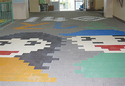 今年140周年を迎えるにあたり、同校ではセレモニーを開催しない代わりに、全校児童243人の思い出に残る制作をしようと企画。特徴でもある玄関のブロックを使用した、全員参加の記念ペイントに取り組んだ。