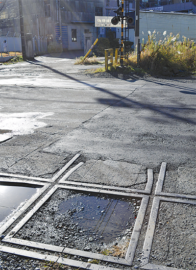 赤錆びた倉庫群が立ち並ぶ田浦港町地域。JR田浦駅から貨物の引込み線用レールが延びている。ここに直角に交わる平面交差「ダイヤモンドクロッシング」と呼ばれる場所がある。