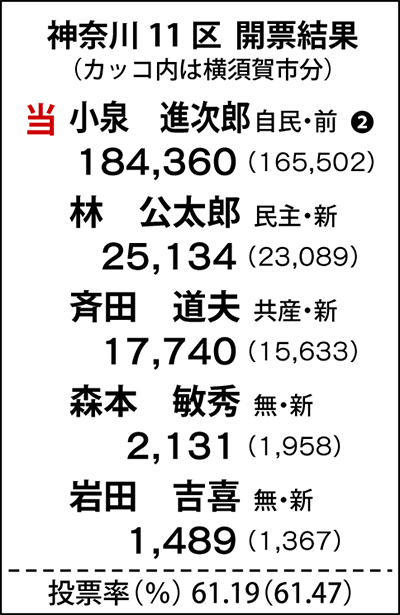 圧倒的な強さだった―。第46回衆院選は16日に投開票が行われ、神奈川11区(横須賀・三浦)では自民党前職の小泉進次郎氏が再選を果たした。「党の顔」として抜群の知名度を誇る小泉氏に対し、民主・共産ら新人4人が挑んだ選挙戦。地元で活動できたのは3日間という小泉氏だが、次点を大きく引き離し、磐石の戦いぶりを見せた。