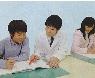 学力アップの基本原則は「なぜ? をそのままにしない」こと。先生1人に生徒2人という学習スタイル(=写真)の同教室では、わからない部分がその場で解説してもらえる。1対2の関係には、生徒自身の考える力を引き出すという狙いもある。1人が教えてもらっている間にもう1人が思考をめぐらせる─これにより学んだ知識が確実に自分ものとなる。