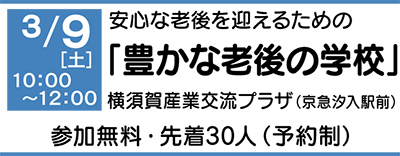 高齢者向けの住宅や施設には様々な種類があり、入居条件、サービスの内容も異なる。医療や介護が必要となった場合の費用負担などの目安も知識として知っておきたい。同講座は、老後の備えを体が動く元気なうちから準備しておくことをすすめるもので、サードライフアドバイザー1級の臼井謙介さんと介護ヘルパー2級の仲畑孝子さんから役立つ話が聞ける。個別の相談も可能。会場は京急汐入駅前の横須賀産業交流プラザ第2研修室(ベイスクエアよこすか1番館3F)。時間は午前10時から正午まで(講座は1時間程度)。定員30人で予約制。