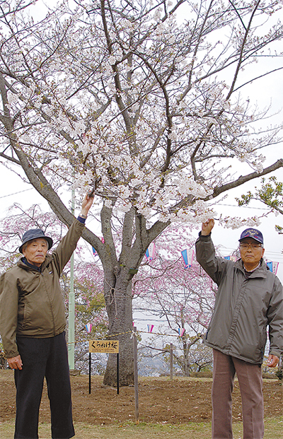 公園内の桜を育成管理しようと、同会では衰えの見られる展望台付近のソメイヨシノを1本選定。おととし10月から1年間、自己負担で購入した活性液を毎週散布し、見守ってきた。これに衣笠小の児童も参加。花咲かじいさんに対して「花咲かチルドレン」というグループをつくり、一緒に樹勢回復に取り組んできた。かつて衣笠山は、馬の背に鞍(くら)を置いた姿に似ていることから「鞍掛山」と呼ばれていた。そこで、この木を「くらかけ桜」と命名。回復のシンボルに位置づけた。