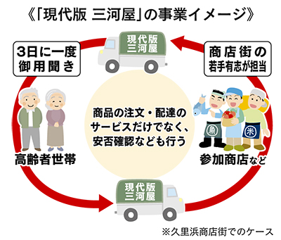 久里浜商店街では市内で活動している公認会計士からの提案を受けて御用聞き事業を具体化させる。「現代版 三河屋」と銘打ったビジネスモデルで、ネット販売や既存の食品宅配サービスを十分に活用できない高齢者宅を注文の有無にかかわらず定期的に訪問するルートを設け、地域住民の利便性を向上させながらビジネスとしての成立をめざす。安否確認などの役割も担う。