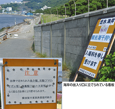 走水海岸で有料潮干狩り場を運営する横須賀市東部漁協走水大津支所は、潮干狩り禁止区域で相次ぐアサリの密漁に頭を抱えている。立て看板や監視で注意を促しているが完全に排除することは困難で、家族連れや転売目的で大量に採捕する違反者が後を絶たない。漁師の生計を脅かす事態となっている。