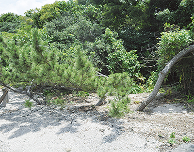 ハマユウが見頃を迎えた天神島臨海自然教育園(佐島3の7の2)に厳しい生育条件に耐え、人知れず命を育むクロマツがある。