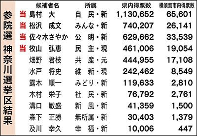 第23回参議院議員選挙は21日に投開票され、4議席を11人が争った神奈川選挙区では、自民党の新人・島村大氏(52)が約113万票を獲得し、トップ当選を果たした。以下、みんなの党の新人・松沢成文氏(55)、公明党の新人・佐々木さやか氏(32)、民主党の現職・牧山弘恵氏(48)と続き、全国と同様に自民、公明の与党が強さを見せた。