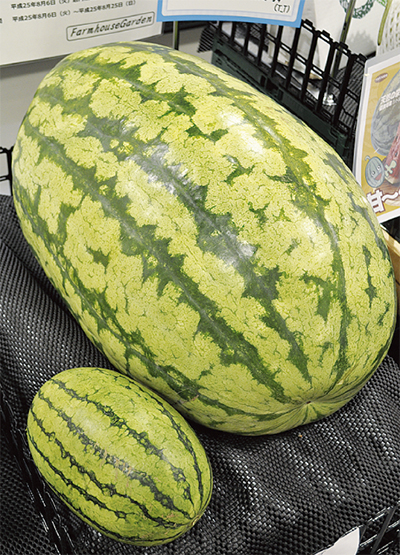 巨大スイカは「カロライナクロス」と呼ばれる品種(=写真)で、三浦市の農家が栽培したもの。直径は約70cm。主に鑑賞用としてイベントや催事などに用いられているという。