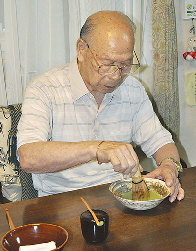 現在は一線から退いたが、自宅のテーブルで毎日お茶を点てる日課は変わらない。妻や息子夫婦に振る舞い、他愛のない会話を楽しんでいる。
