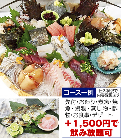 宴会コースには、便利な送迎付プランも用意(15人〜/料理・往復送迎代込1人5千円〜/2週間前予約)。横須賀、三浦、逗子、葉山の指定場所へ送迎バスを運行。2次会等の都合に合わせて往路のみ、復路のみの片道予約でもOK(料理・送迎代1人4千円〜)。
