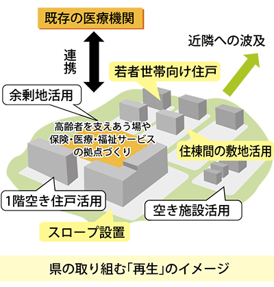 県内にある219の県営住宅の高齢化率は、今年4月現在36・0%。高齢者の単身世帯は居住全世帯の22%にあたり、入居者の高齢化が顕著となっている。孤独死やコミュニティの低下も課題となっており、県では、「健康団地」というコンセプトを掲げ、団地再生の取り組みを開始した。高齢者が健康に暮らすことのできるサービスや施設を付帯させることで、団地の居住性を高めるのが狙いだ。