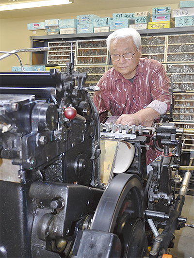 「活版で印刷した字にはずっしりとした『重み』があるんですよ」。そう魅力を話すのは、同印刷所の林俊明さん(68)。この道50年、活版印刷機を操作できる市内でも数少ない職人の一人だ。一番小さい活字は一辺が2㎜にも満たない。注文通りの図柄になるよう、時には虫メガネを使い、数十万本以上の活字の中から一つずつ選んでいく。