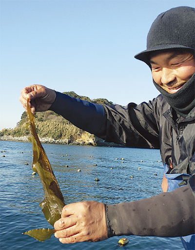 海流が早い漁場で養殖される猿島のわかめ。東部漁協横須賀支所の若手メンバーや市内の飲食店オーナーらが「猿島海畑活性化研究会」を結成し、養殖棚を共同運営している。同会では収穫が本格化する前の新芽を「さるひめ」と名付けてブランド化。昨年11月には種付体験イベントなども行い、普及に取り組んでいる。
