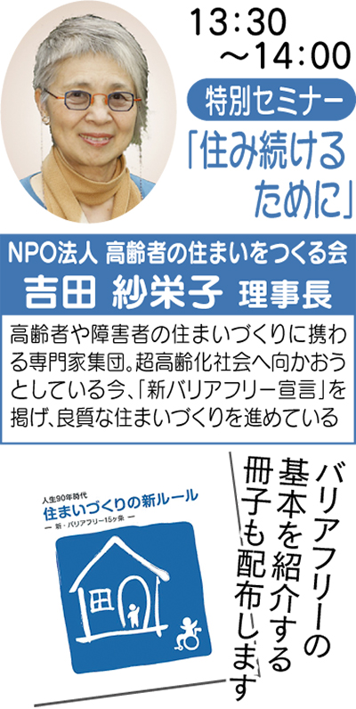 バリアフリーのセミナーを担当するのはNPO法人「高齢社会の住まいをつくる会」の吉田紗栄子理事長。高齢者を支える”対応力・包容力・支援力”をバリアフリーの柱と掲げ、「長く住み続けるためにできること」を説いていく。「身体も心も健康に過ごすには、住まいの快適さも必要です。当日は質問や相談も大歓迎」と同営業所の夏井所長。住まいの内側(バリアフリー)と外側(耐震補強)がしっかり学べる1日になりそうだ。