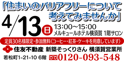 そうした「バリアフリー」の本質をひとつひとつ丁寧に紐解くセミナーが4月13日(日)、メルキュールホテル横須賀(1階サロン)で行われる。主催するのは、住まいのリフォームを手掛ける住友不動産新築そっくりさん横須賀営業所。当日は、耐震補強に高い実績を持つ、同社による地震対策の相談会も実施する。
