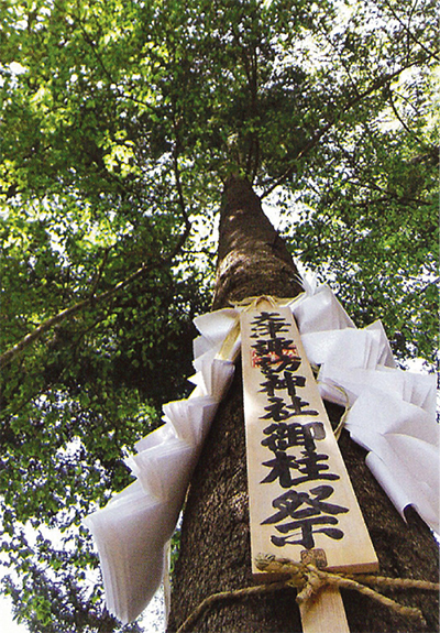神輿会(諏訪十神連合)の協力のもと、総代世話人会などで結成した実行委員会が準備を進める。すでに昨年、同祭で切り出される「御柱」の見立てが済んでおり、直径約1m、高さ約12mの木に決まった=写真。初日の早朝、長野県から大津に運び込まれる。岩城宮司は「日本古来の伝統を知る良い機会。信州の文化との融合を通し、横須賀の活性にも繋げたい」と話している。