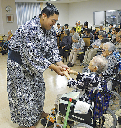 3力士は質問への返答や記念撮影、握手などを通して入居者たちと交流=写真。入居者からは「頑張ってください」という激励のほか、「ハンサムで素敵な方」と喜びの声も上がっていた。