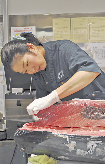 新港町のよこすかポートマーケットでひそかに注目を集めている女性がいる――。「鉄火鮪 興慶丸(こうけいまる)」でマグロの解体を担当している店長の瀧澤可奈さん(28)=写真=だ。60kgを超える冷凍メバチマグロをさばくのは男性でも一苦労だが、慣れた手つきで包丁を入れていく。解体を任されるようになって早1年。見物客から「細腕だけど大丈夫?」「こんな可愛いお姉さんがさばくのか」と声をかけられることもしばしば。「足腰が痛くなることもありますが、もう慣れました」と笑顔をみせる瀧澤さん。事務員だった入社時から一転、今や”活きのいい”看板娘だ。