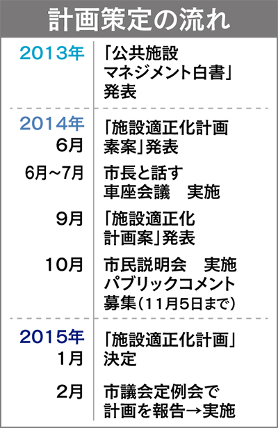 市が所有する公共施設のうち、約6割が既に建築後30年を経過し、今後建て替えや改修など、多額の更新費用を要すると見込まれる。一方で、人口減や少子高齢化が進み、市税など歳入の減少と歳出増加が予測される。そこで市では昨年、「公共施設マネジメント白書」を作成し、市の現状を明らかにした。これを基に、「施設適正化計画」の素案を策定。6月から7月にかけて行われた市長との「車座会議」や、識者らによる検討委員会の答申を経て、「計画案」の公表となった。