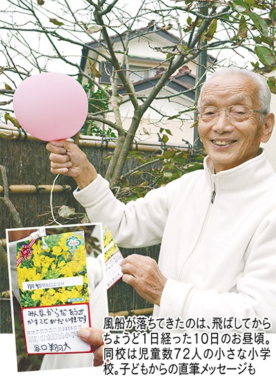 「天気が良かったから、庭先で新聞を読んでいたんだよ。そうしたら、ピンクの風船が、柿の木の上に落ちてきて」―。そう話すのは、長井3丁目在住の松本喜久次さん・文子さんご夫妻。見ると、風船には紐で繋がれて花の種が付いており、『11月9日マル勝まつり 福岡県福津市勝浦小学校』と書いてあった。福岡から、はるばる長井まで旅をして来た風船に驚いた松本さん。学校で飛ばしたものだろうと想像しながら、早速お礼の手紙を出したという。