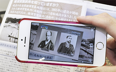 今月15日(土)実施の「ヴェルニー・小栗祭式典」を皮切りに配布を開始する、横須賀製鉄所(造船所)のパンフレットにもAR機能を採用。来年創設150周年を迎えることを記念し作られたもので、「AR」のマークがついた製鉄所の画像から、建設の立役者である小栗上野介やフランス公使ロッシュの紹介動画を見ることができる。市広報担当は、予算面などで制限があるとした上で「今後はさらに最新技術を活かしたコンテンツを用意していきたい」と話す。