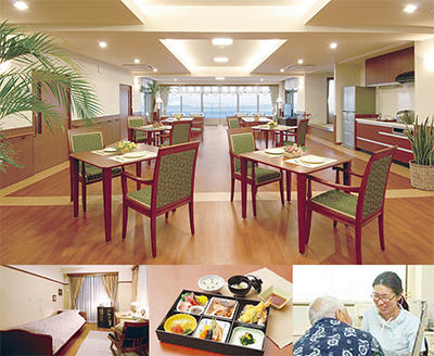 リゾートホテルさながらの居住環境に加えて、三浦半島では数少ない24時間看護師が常駐する安心の体制。ユニットケア方式を取り入れた手厚い介護に専任の機能訓練士による個別リハビリなど、健康な自立者も要介護者も快適な生活を実感できるサービスを提供している。